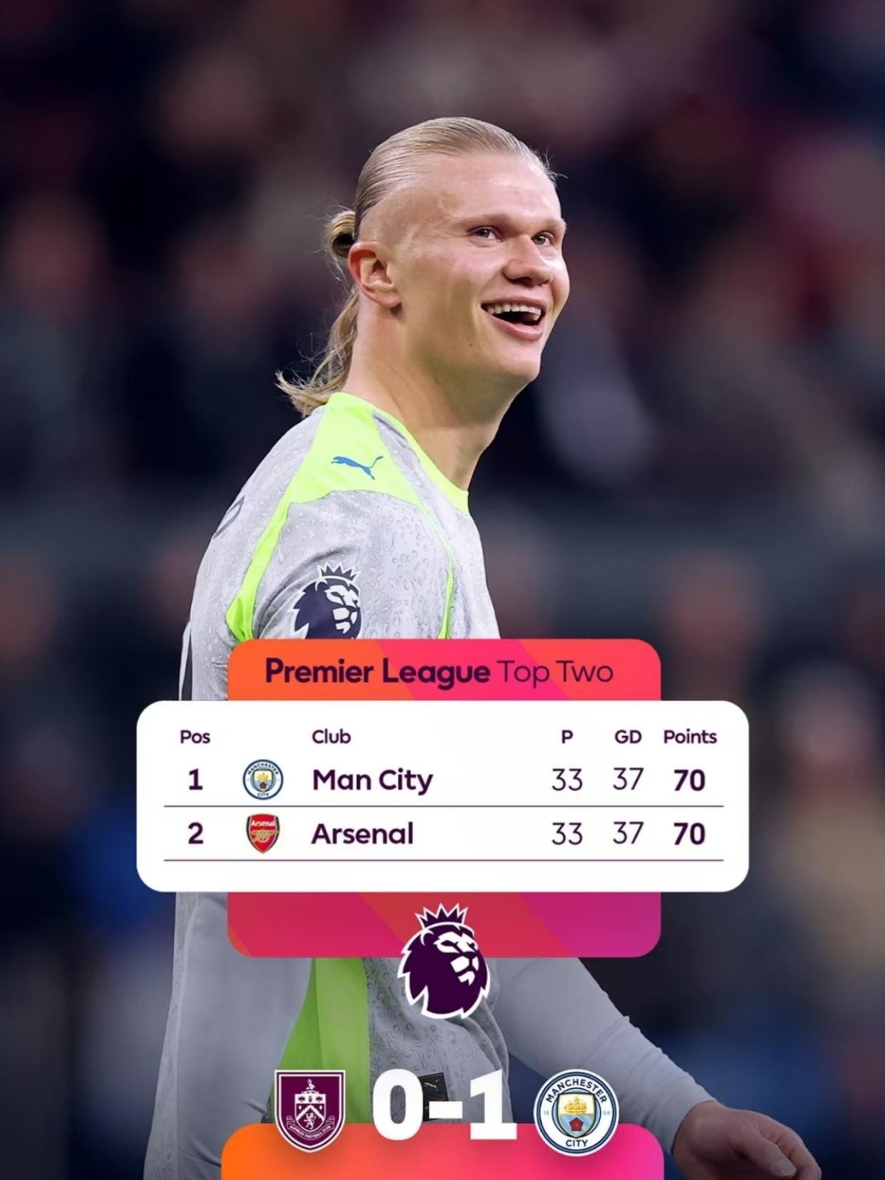 今天凌晨借助哈兰德的巧妙进球,曼城在客场1-0小胜伯恩利,联赛积分榜登顶的同时送伯恩利提前降级!
