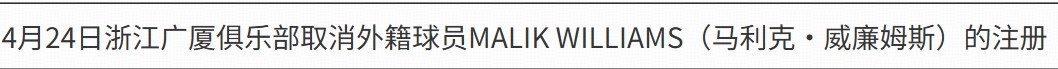 威廉姆斯于4月14日正式加盟浙江广厦,目前仅代表俱乐部出战2场常规赛,场均登场9分钟得到3.5分2篮板1助攻。