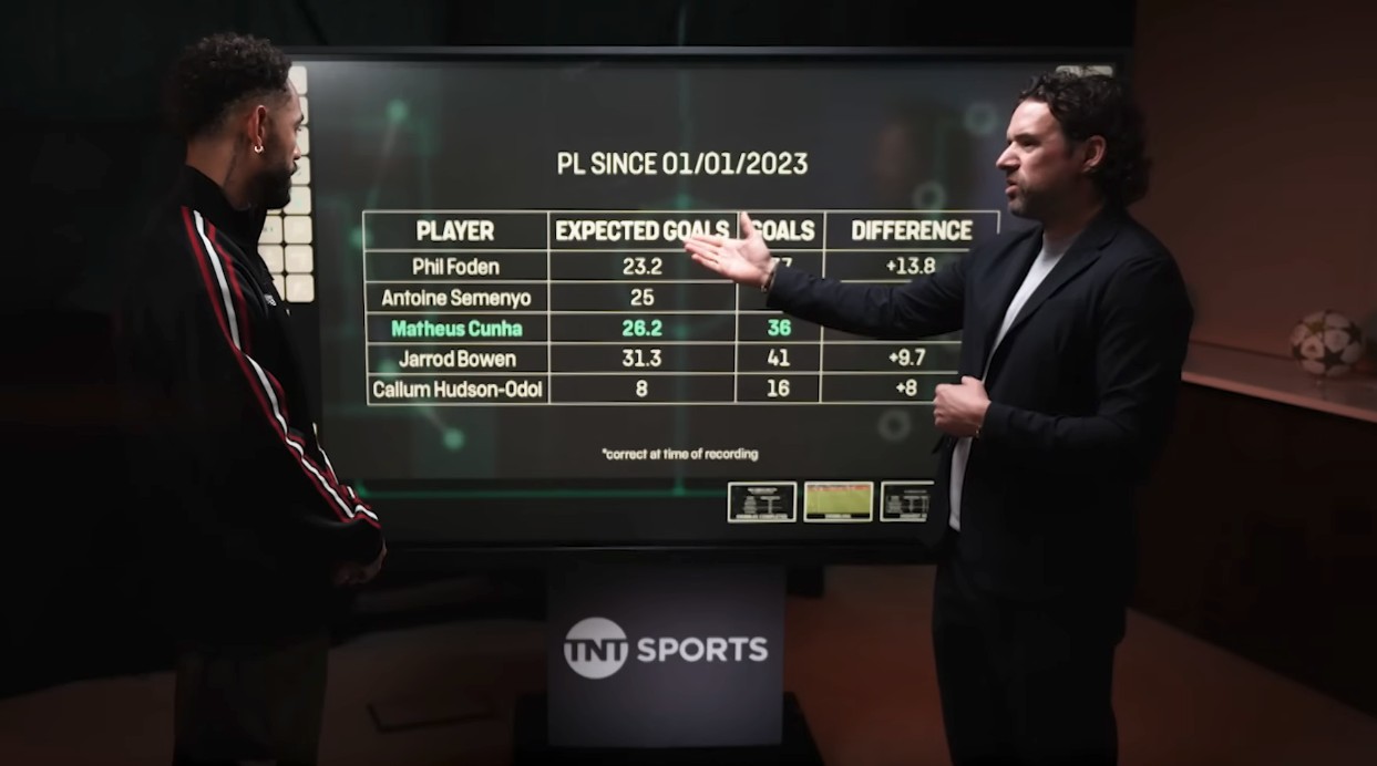 我经常跟球员们说这些,你知道,每当我们采访球员时,大家的反应都差不多,他们会说:“哇,这些数字太疯狂了。”但基本上,这些数据说明了你的进球率更高,因为你有很多进球基本上都来自禁区外。你看,基本上布鲁诺-费尔南德斯他们的进球数比你多,但他们在禁区外的机会转化率并没有那么出色。而实际上,这正是你比赛中最棒的部分之一,不是吗?就是那种在禁区边缘的终结能力。这对你来说感到意外吗?或者说实话,你感觉如何?