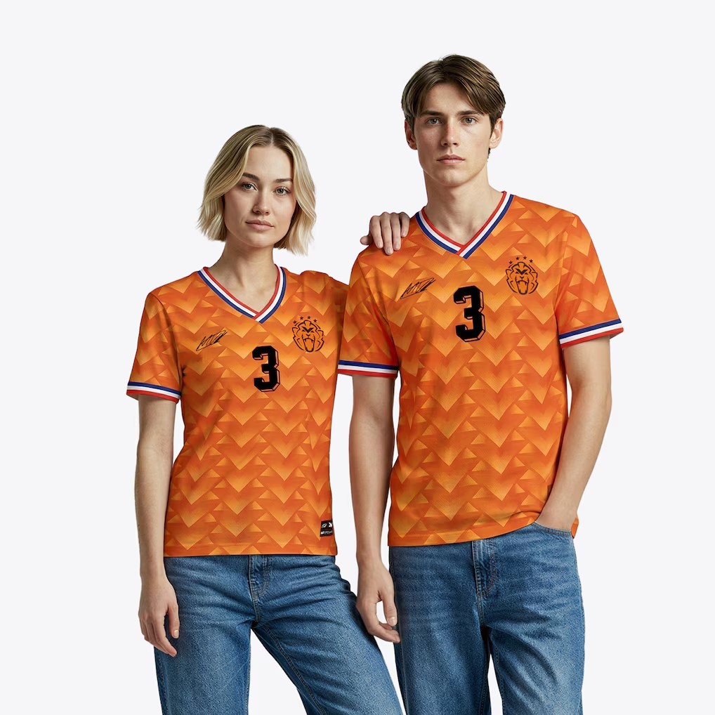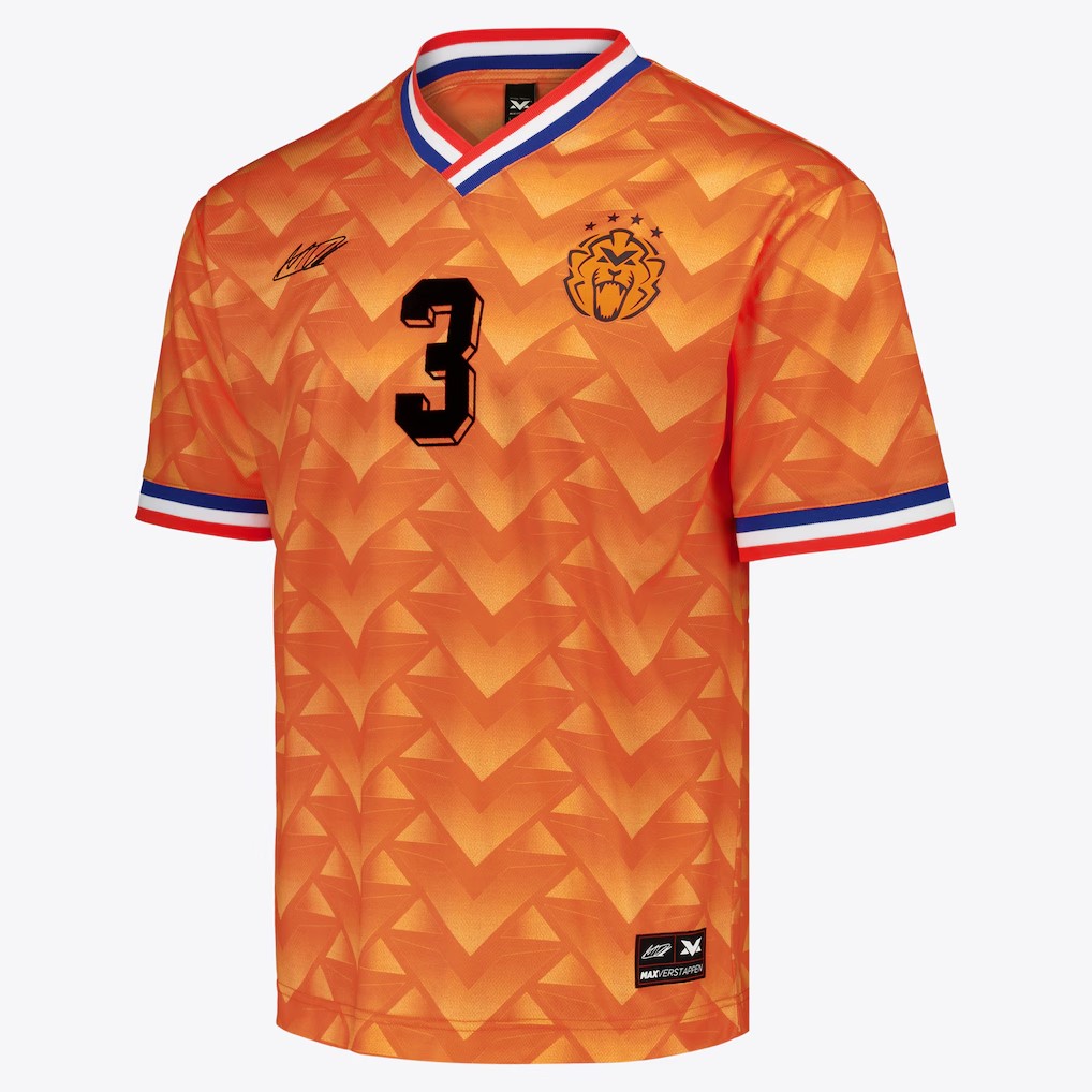 这款球衣整体以橙色为主色调,致敬荷兰国家代表色。衣身采用大面积几何图案,直接呼应1988年那件由阿迪达斯打造的经典球衣,同时在细节上进行了巧妙改造:传统的阿迪达斯标志被维斯塔潘的个人签名所取代,原本的荷兰足协(KNVB)队徽也被重新设计为一个定制化的狮子图案。
