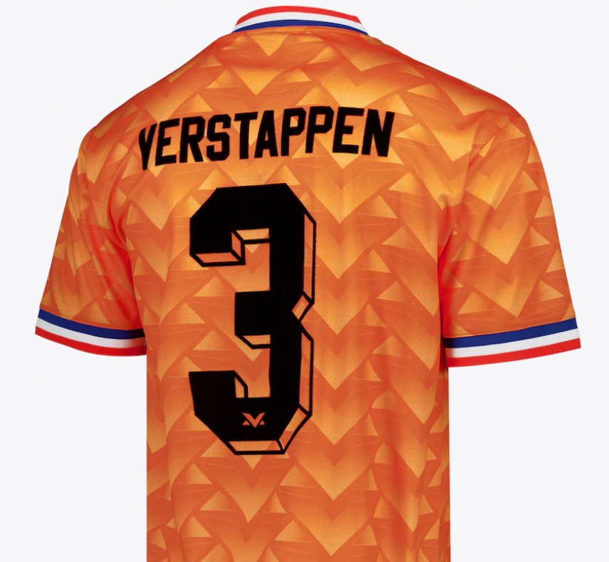 球衣背面印有“Verstappen”字样以及他的号码“3”,字体采用90年代风格的立体块状设计,向当年足球球衣号码的经典视觉致敬。
